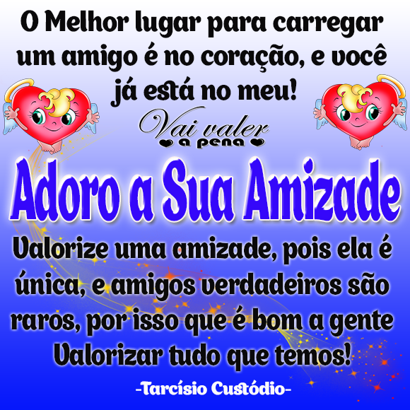 O melhor lugar para carregar um amigo é no coração, e você já está no meu! Valorize uma amizade, pois ela é única, e amigos verdadeiros são raros, por isso que é bom a gente valorizar tudo que temos!Que Deus abençoe suas amizades, pois amigos de verdade sempre entram em oração uns pelos outros!